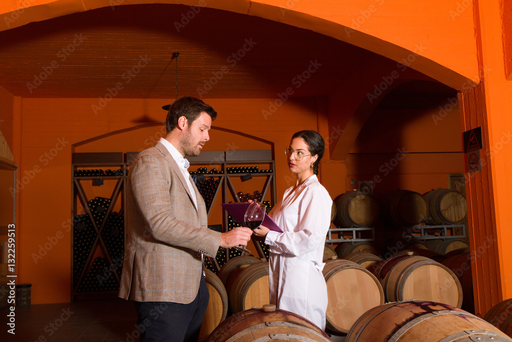 Canvas Print Winemaker with expert woman oenologist chemist in winery cellar.