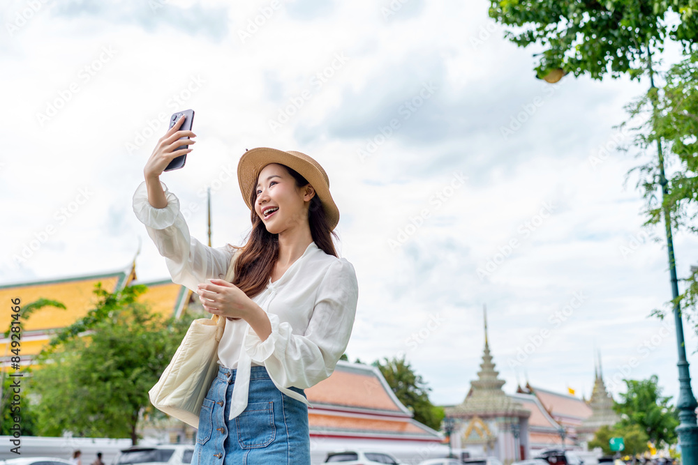 Canvas Print Joyful Asian Woman Taking Selfie at Famous Thai Landmark