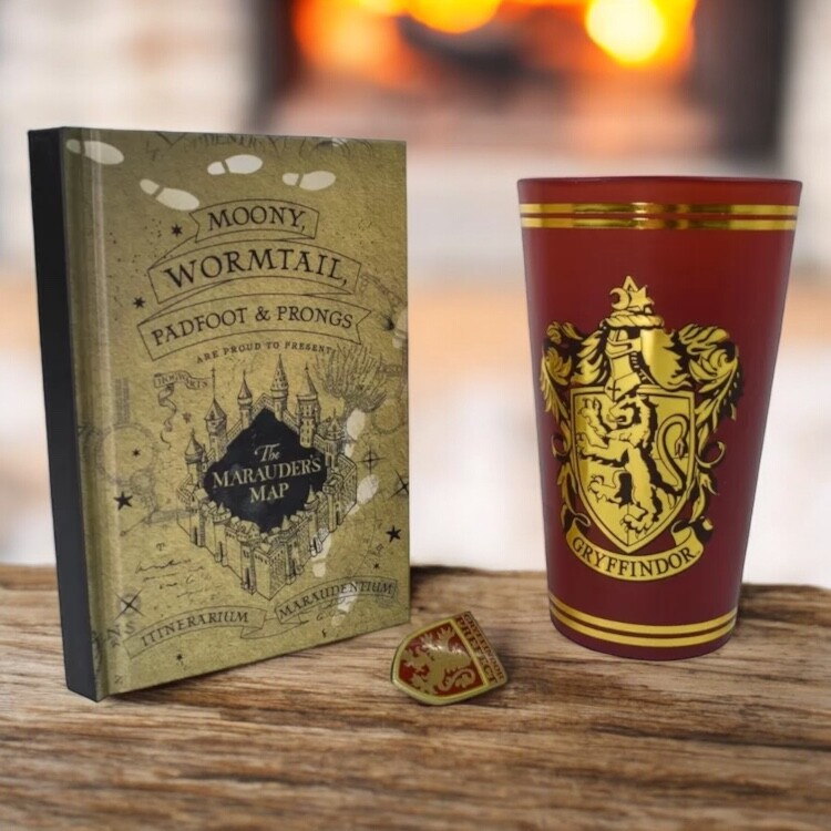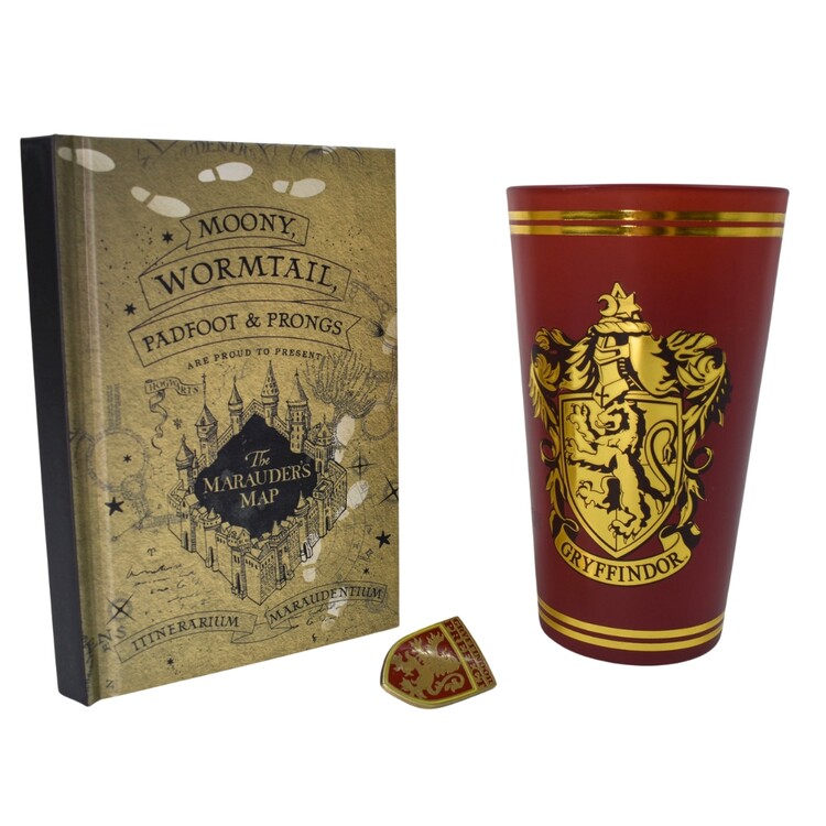 An indispensable set for magicians from the Gryffindor college - glasses, lined A6 notebook and Gryffindor badge.