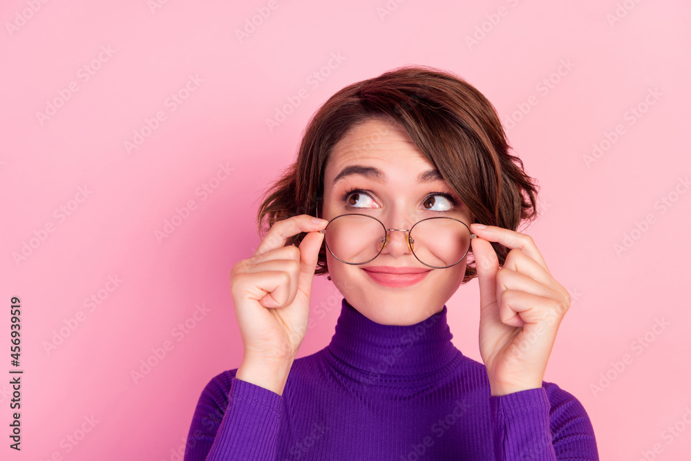 Canvas Print Photo of curious brunette young lady hold spectacles look empty space wear viole