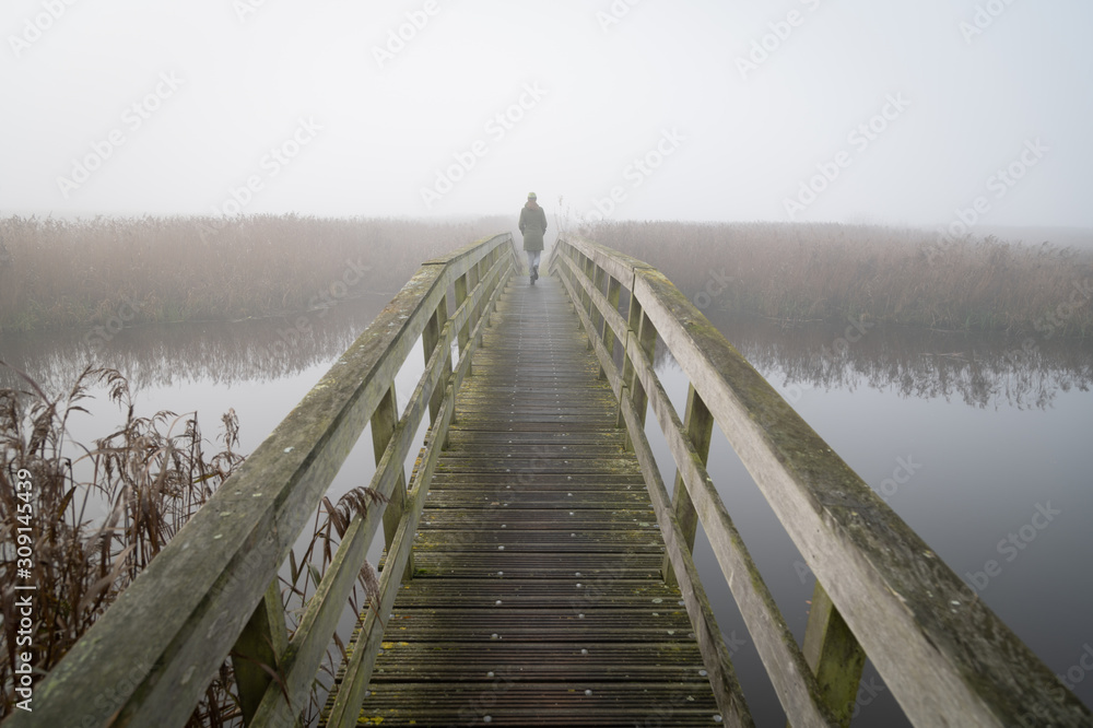 Sticker A woman walking on a small footbridge on a foggy day in autumn.