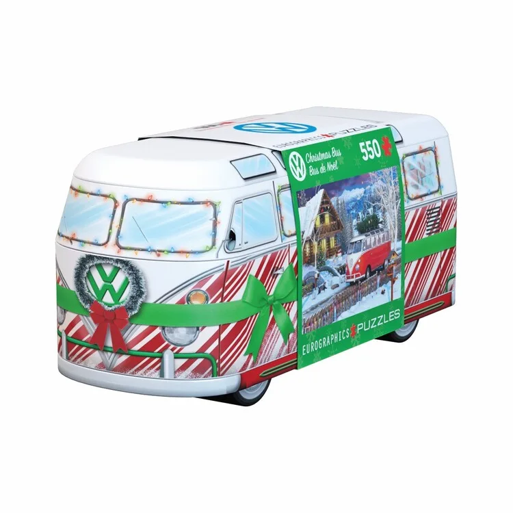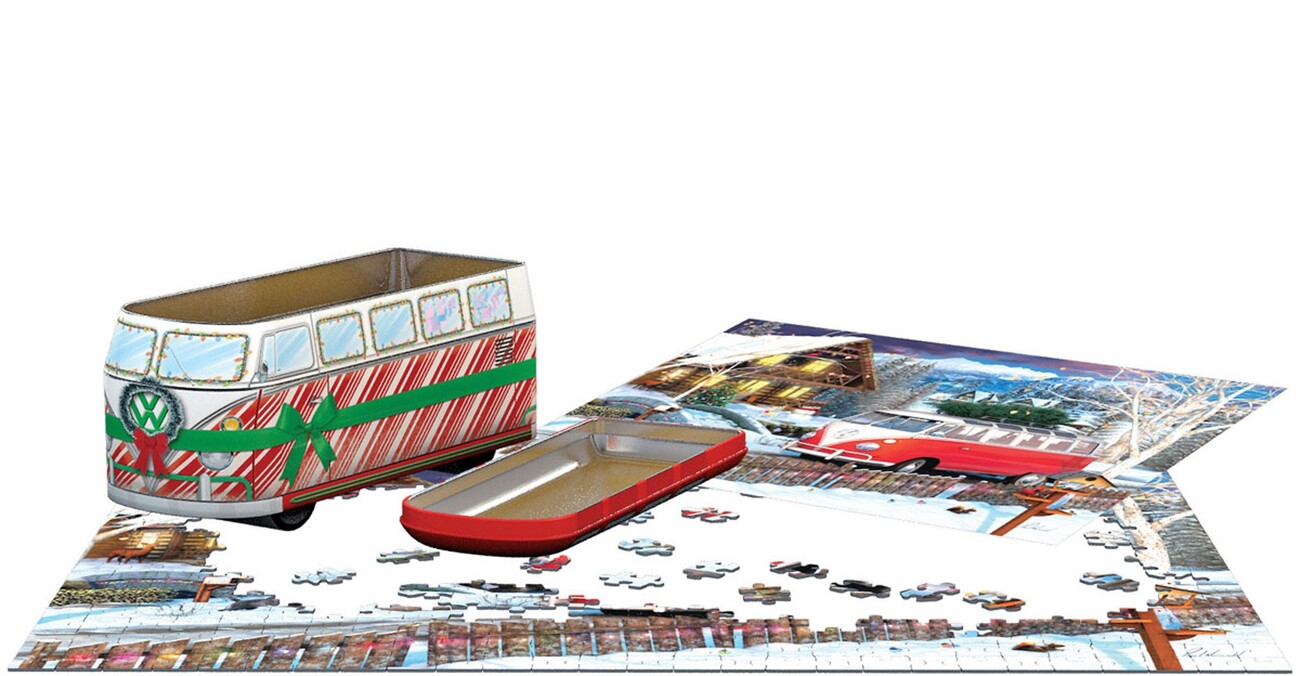 Iconic VW bus in a festive look as a 550-piece puzzle in an embossed tin. Precisely cut pieces fit together easily. Bonus included: a poster with the motif – use as a reference or as decoration. Officially licensed. Eco-friendly production from recycled and responsibly sourced materials. Recommended age: 12+.