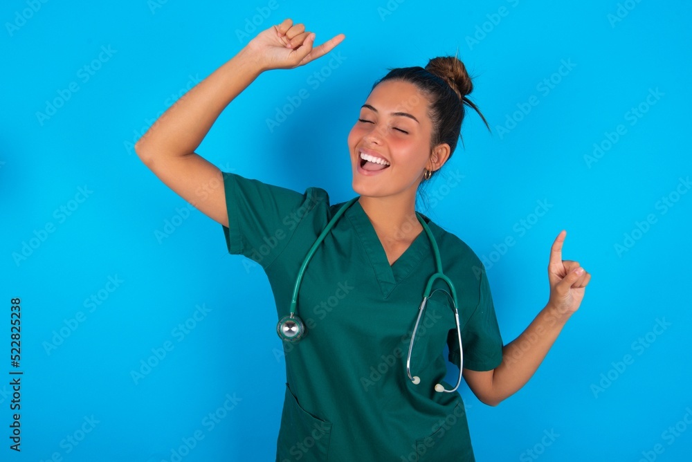 Wall Mural Photo of upbeat beautiful doctor woman wearing medical uniform over blue background has fun and dances carefree wear being in perfect mood makes movements